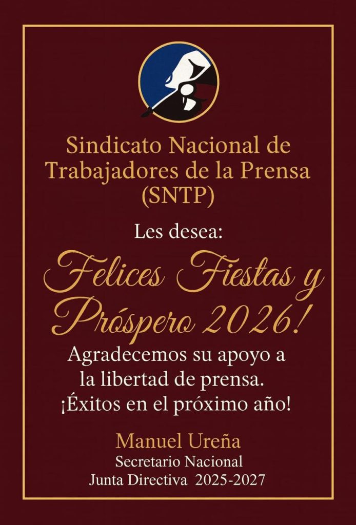 Manuel Ureña, secretario general del SNTP, en nombre del Comité Ejecutivo Nacional (CEN) del Sindicato Nacional de Trabajadores de la Prensa y sus 35 filiales en todo el territorio nacional, desea que en esta navidad reine la paz y la armonía en cada uno de los hogares dominicano.